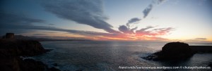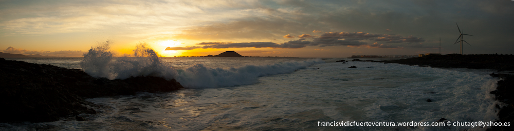 Puesta de sol desde El Cotillo con el Roque y un cielo rojizo.Amanecer desde detrás del muelle de Puerto del Rosario.Impresionante amanecer desde una cala detras de Bristol en Corralejo, con La Isla de Lobos como estrella.Puesta de sol desde la montaña de La Muda hasta el barranco de Guisguey.