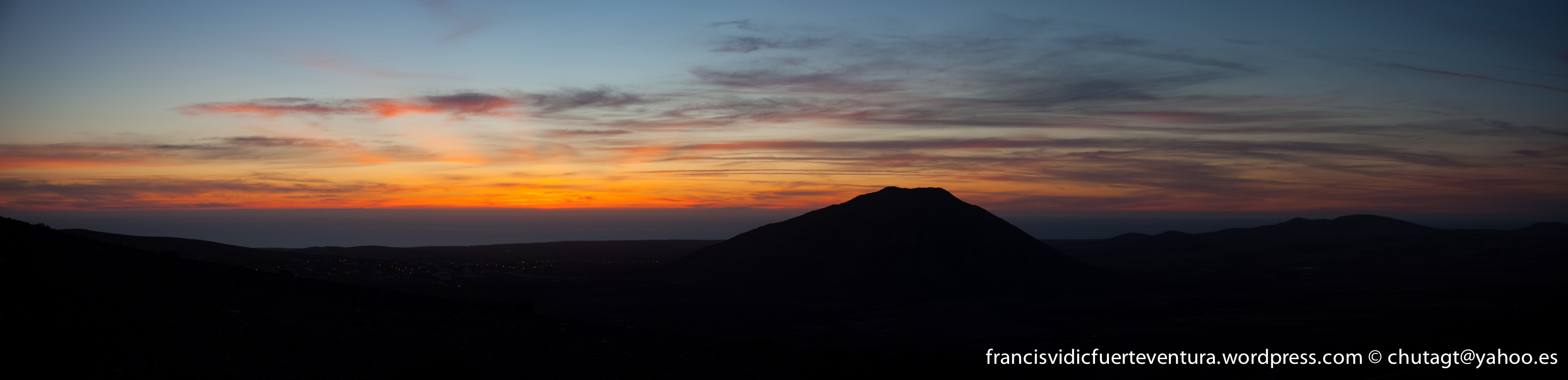 Con un buen tripode y abrigo se pueden apurar los últimos momentos de la puesta de sol.Situados desde el mirador de Vallebrón en un día totalmente despejado donde aparecieron esasnubes del horizonte para realizar la fotografia.Panorámica de 7 imágenes editadas con lightroom y compuestas con el photomerge de photoshop cs5.