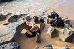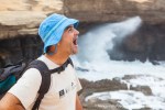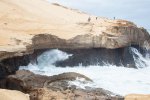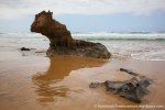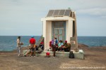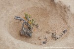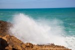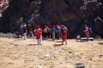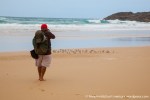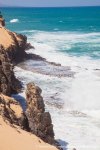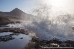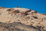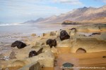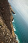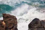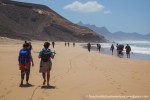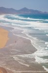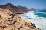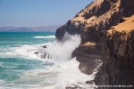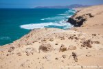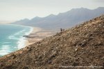Esta es una ruta larga y muy difícil que necesita de dos días para realizarla sin ir a toda mecha. Salimos desde Agua tres Piedras al pie del Alto de Agua Oveja y vamos costeando por este litoral donde encontraremos infinidad de calas de arena, cuevas y refugios pesqueros aun usados en la actualidad. Punta de la Paloma, Punta de las Eras, Punta playa Larga son algunos de los lugares por los que pasaremos hasta llegar a la Playa de Barlovento que es el inicio de la larga playa de Cofete, es recomendable calcular las mareas para que cuadre en marea baja y así cruzar toda la playa por la costa y evitar estar subiendo y bajando barrancos todo el rato aunque esa es una opción y otros prefieren barranquiar. Durante tres horas aproximadamente caminamos por la playa de Barlovento hacia el Islote de Cofete o de las Siete Mujeres, llamado así por la desaparición de siete mujeres en este lugar hace algunos años, dejamos a un lado la casa de los Perez, el pueblo de Cofete, y el Cementerio nos dirigimos hacia el Roque del Moro siempre con la vista de todo el Macizo de Jandía con la Zarza y el Fraile como los más llamativos.Al día siguiente partimos temprano hacia el Roque del Moro para subir por el barranco de Agua Oveja y cruzamos por la base de la Montaña Aguda hacia Montaña Azufra. Es un sendero de cabras muy estrecho y peligroso en algunos momentos y esta cortado justo debajo de la montaña por lo que hay que subir hacia la cima sin llegar arriba y cruzar a la degollada. Al llegar a la degollada retomamos el sendero y nos dirigimos hacia la Punta de Barlovento, es una zona de jable y de nidificación de gaviotas, desde aqui vemos todas las puntas de el litoral, Punta Junquillo, Punta del Mal Rayo y el Faro de Punta Pecebre. En esta zona hay muchas cuevas de jable, senderos que bajan hacia las playas de los acantilados, laperos, y muchas piscinas naturales. Entre la zona de Los Salvajes y Rabo de Ratón hay una bajada hacia una cueva enorme y muy profunda que veremos desde el pie del acantilado, al otro lado, separado por un jurado hay un impresionante bufadero. Desde aquí hasta el faro de Punta Percebe hay unos 200 metros. Dificultad: Muy alta con tramos para expertos Duración: Día y medio